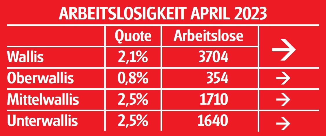 Im Jahresvergleich (April 2022 bis April 2023) ist eine Verbesserung der Lage erkennbar. Der Kanton Wallis verzeichnete in dieser Zeit einen Rückgang der Zahl der angemeldeten Arbeitslosen um 10,6% (-438 Arbeitslose).