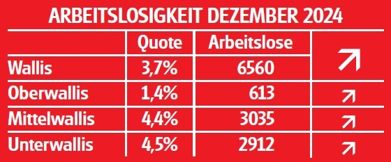 Ende Dezember waren in den Regionalen Arbeitsvermittlungszentren (RAV) des Wallis 6’560 Arbeitslose gemeldet. Im Vergleich zum Vormonat sind dies 1’305 mehr. Die Arbeitslosenquote stieg um 0,7 Prozentpunkte auf 3,7 Prozent.