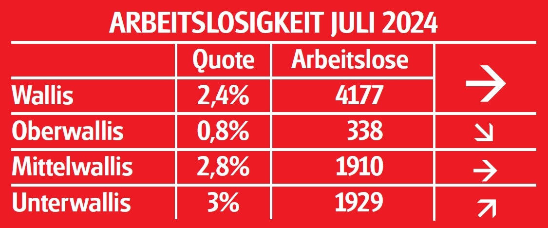 Ende Juli waren im Wallis 4177 Arbeitslose bei den Regionalen Arbeitsvermittlungszentren (RAV) angemeldet, d.h. 34 weniger als im Vormonat. Die Arbeitslosenquote im Wallis blieb unverändert bei 2,4%.