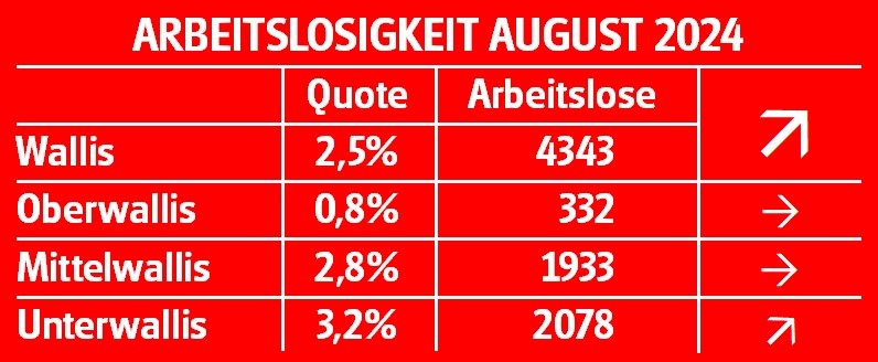 Ende August waren in den Regionalen Arbeitsvermittlungszentren (RAV) des Wallis 4343 Arbeitslose gemeldet. Im Vergleich zum Vormonat sind dies 166 mehr. Die Arbeitslosenquote pendelt sich im Wallis bei 2,5% (+ 0,1 Punkte) ein.