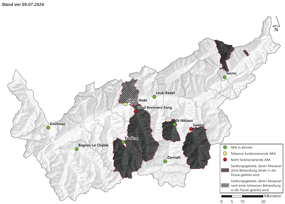 Um die Auswirkungen der Unwetter auf die Walliser Kläranlagen (ARA) zu ermitteln, hat die Dienststelle für Umwelt (DUW) mit den Betreibern eine erste Lagebeurteilung vorgenommen. Sieben ARAs oder ihre Abwassernetze, die sich in den direkt von den Überschwemmungen betroffenen Gebieten befinden, wurden erheblich beeinträchtigt. Es handelt sich um Siders-Noës, Saastal, Zermatt, St. Niklaus, Anniviers, Evolène und das Goms. Insbesondere die ARAs von Sierre-Noës und Saastal melden zahlreiche Schäden und stehen auf unbestimmte Zeit still. In anderen Regionen wurden die Kanalisationen beschädigt, was die Weiterleitung und Behandlung des Abwassers behindert. Die betroffenen kantonalen und kommunalen Behörden sowie die Betreiber arbeiten mit Hochdruck daran, so schnell wie möglich Ersatzlösungen zu finden (z. B. provisorische Pumpen usw.). Die DUW hat eine Internetseite mit einer Karte sowie Informationen unter folgender Adresse aktiviert vs.ch/etat-step.