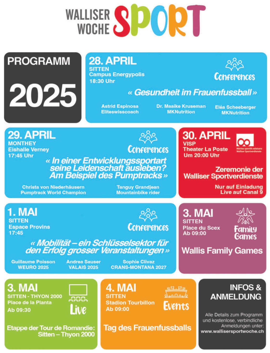 Im Laufe der Woche ist am Montag, den 28. April eine erste Konferenz in Sitten geplant, die in Zusammenarbeit mit dem Walliser Fussballverband (WFV), des SpArk und der HES-SO Valais-Wallis organisiert wird und das Thema «Ernährung und mentale Vorbereitung im Frauenfussball» behandelt. Am Dienstag, den 29. April, findet in Monthey eine zweite Konferenz zum Thema «Wie kann man in einem Entwicklungssport von seiner Leidenschaft leben?» statt. Am Donnerstag, dem 1. Mai, findet in Sitten ein zum Thema «Mobilität als Schlüsselsektor für den Erfolg von Grossveranstaltungen» statt, an dem unter anderem Herr Guillaume Poisson, der Chef der Operationen der Frauenfussball-EM 2025 teilnimmt. In dieser Ausgabe wird auch eine Etappe der Tour de Romandie (Sion - Thyon 2000) auf dem Place de la Planta in Sion am Samstag, dem 3. Mai, stattfinden. Die Walliser Sportwoche endet am Sonntag, den 4. Mai, mit einem Tag, der dem Frauenfussball gewidmet ist.
