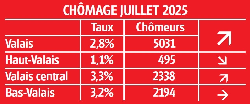 À la fin juillet, 5031 chômeurs étaient inscrits auprès des offices régionaux de placement (ORP) valaisans, soit 72 de plus que le mois précédent. Le taux de chômage a augmenté de 0,1 point pour s’établir à 2,8%.