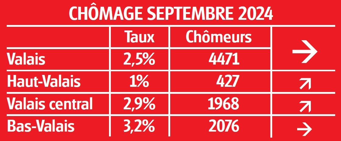 À la fin septembre, 4’471 chômeurs étaient inscrits auprès des Offices régionaux de placement (ORP) valaisans, soit 128 de plus que le mois précédent. Le taux de chômage en Valais est resté stable à 2,5%.